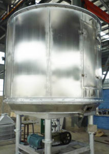 El material húmedo se alimenta continuamente a la primera capa de secado en la parte superior del secador.Será girado y agitado por rastrillos cuando el brazo rastrillo gira y caer hasta el borde exterior de la placa de secado grande a lo largo de la línea helicoidal exponencialEl material se desplazará desde la pequeña placa de secado hasta su borde exterior y caerá hasta el borde exterior de la gran placa de secado debajo.Tanto las placas de secado pequeñas y grandes se organizan alternativamente para que los materiales puedan pasar a través del secador continuamenteEl medio térmico puede ser vapor saturado, agua caliente o aceite térmico.Los materiales secos caerán de la última capa de la placa de secado al fondo del secador y luego se traslada por rastrillos a la salida de descarga. La humedad del material se eliminará de la salida de escape en la tapa superior. Para el secador de placas de tipo vacío, la humedad será aspirada por la bomba de vacío en la tapa superior.Los materiales secos se descargarán de la capa inferiorLa capacidad de secado puede mejorarse si el secador está equipado con dispositivos complementarios como un calentador con aletas, un condensador para la extracción de disolventes, un depurador de bolsas, un mecanismo de retorno y mezcla, un ventilador de corriente,y etc..